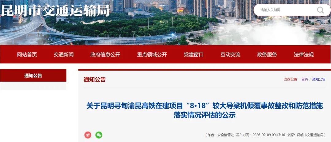 云南省昆明市交通运输局2月9日发布《关于昆明寻甸渝昆高铁在建项目“8·18”较大导梁机倾覆事故整改和防范措施落实情况评估的公示》。ehs.cn