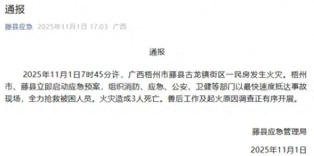 广西梧州市藤县应急管理局发布通报 2025年11月1日7时45分许 藤县古龙镇街区 一民房发生火灾 火灾造成3人死亡 善后工作及起火原因调查正有序开展