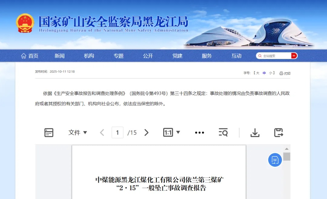 10月11日,国家矿山安全监察局黑龙江局公布了《中煤能源黑龙江煤化工有限公司依兰第三煤矿“2·15”一般坠亡事故调查报告》。经调查认定,该事故是一起因作业人员违章,安全管理不到位导致的生产安全责任事故。