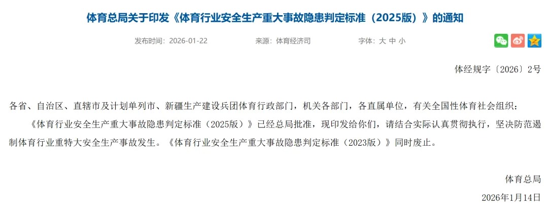 为坚决防范遏制体育行业重特大安全生产事故发生,近日,国家体育总局印发《体育行业安全生产重大事故隐患判定标准(2025版)》。ehs.cn