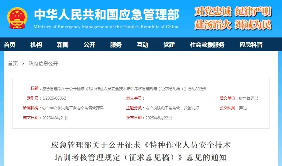 2025年08月26日为进一步规范特种作业人员安全技术培训考核工作,提高特种作业人员安全技术水平,强化便民利企,应急管理部组织对《特种作业人员安全技术培训考核管理规定》进行了修订,形成了征求意见稿(见附件1)。