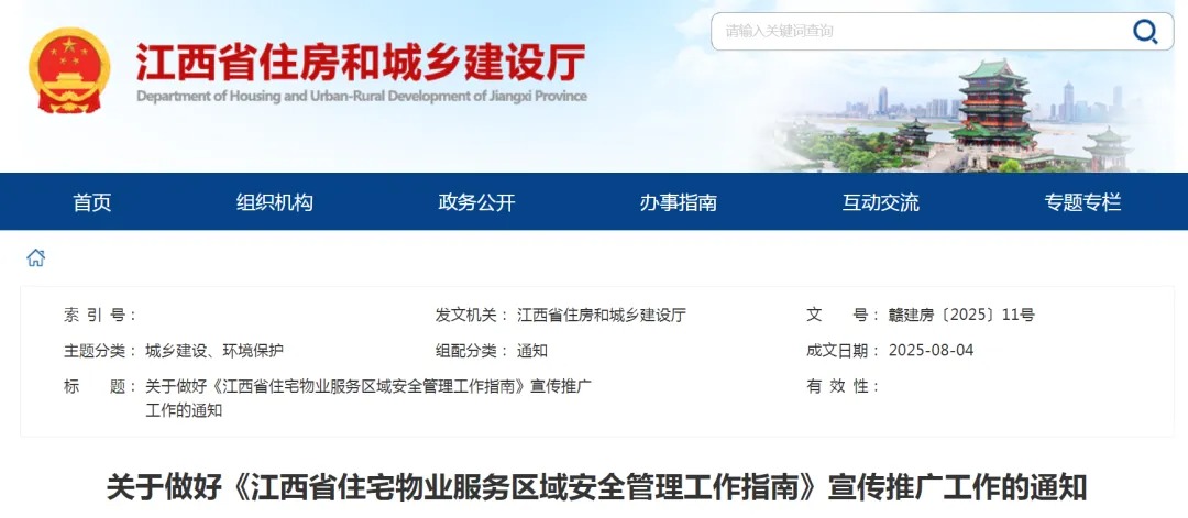 2025年08月27日《江西省住宅物业服务区域安全管理工作指南》(以下简称《指南》)梳理了国家和江西省有关法律法规,总结了近年来物业管理行业安全管理实践经验和典型事故,内容涵盖治安防范、消防安全、设施设备安全、环境安全等方面,为物业服务企业完善健全安全生产制度、规范安全生产行为、加强安全生产培训、提升安全服务水平等提供了