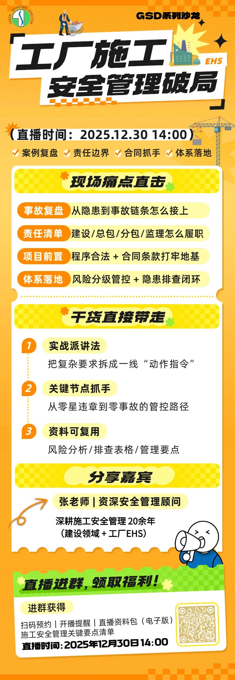 施工安全管理最烦的就是:制度写得挺全,到了现场还是一地鸡毛——交底走个过场、分包链条说不清、临时变更没人盯、出了事还拿不出一条完整的证据链。12月30日这场GSD直播,我们不讲空话,就用真实案例把事故是怎么一步步“凑齐条件”的拆开讲清楚!ehs.cn