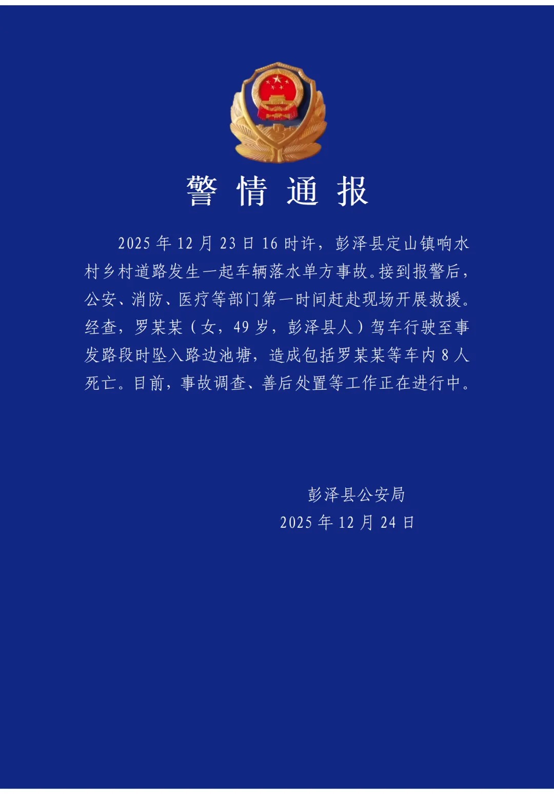 江西省彭泽县公安局12月24日发布警情通报:2025年12月23日16时许,彭泽县定山镇响水村乡村道路发生一起车辆落水单方事故。接到报警后,公安、消防、医疗等部门第一时间赶赴现场开展救援。经查,罗某某(女,49岁,彭泽县人)驾车行驶至事发路段时坠入路边池塘,造成包括罗某某等车内8人死亡。目前,事故调