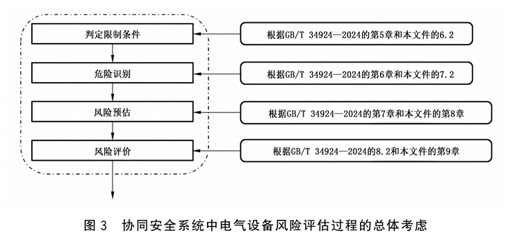 2025年09月07日5.2 电气设备风险评估过程的总体考虑协同安全系统中电气设备的判定限制条件、危险识别、风险预估和风险评价,在图2的基础上,除考虑GB/T34924—2024规定的内容外,宜补充考虑本文件的6.2、7.2、第8章和第9章,见图3