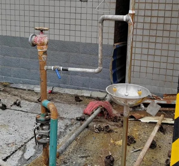 笔者在一家生产硫酸的企业检查时 发现硫酸储罐区附近安装的淋洗器 其冲洗水源与消防水系统连接 而消防水系统同时还与工业水管道相连